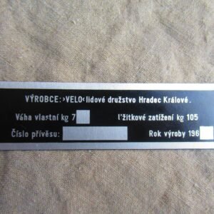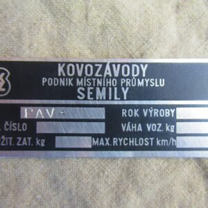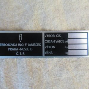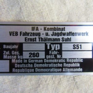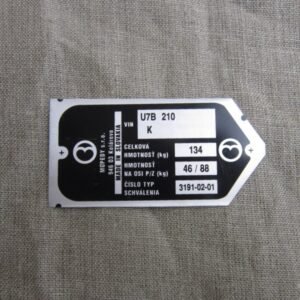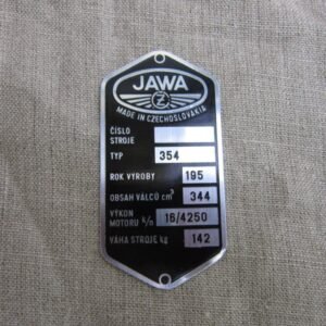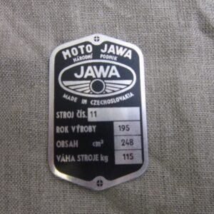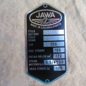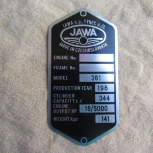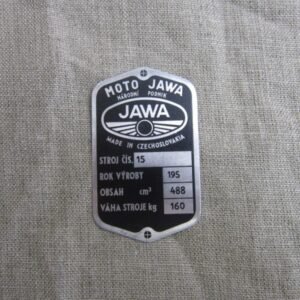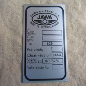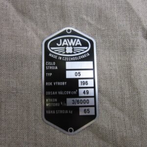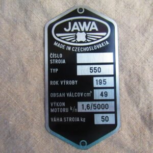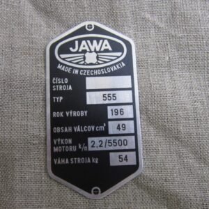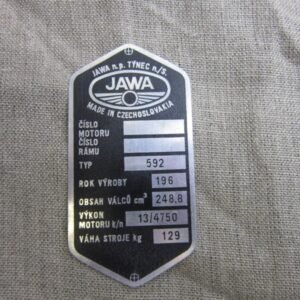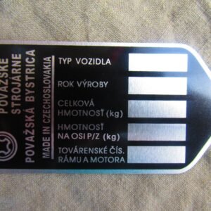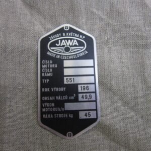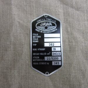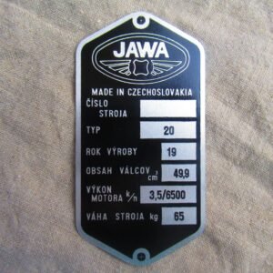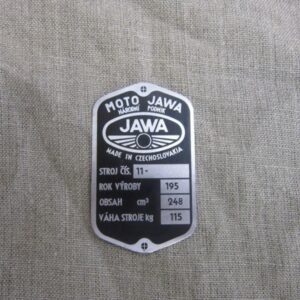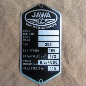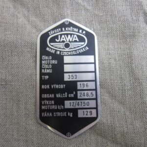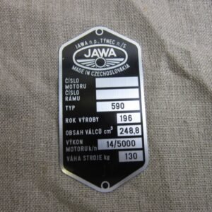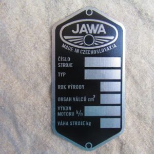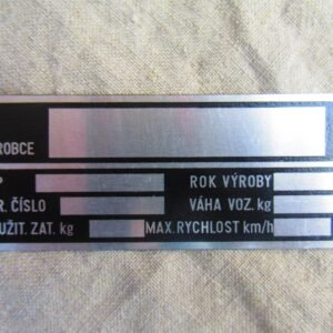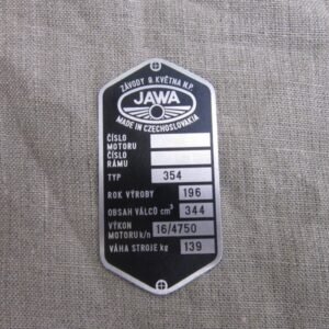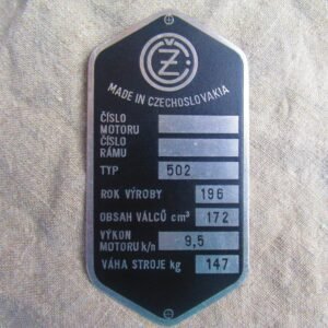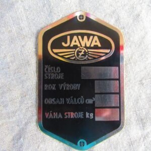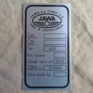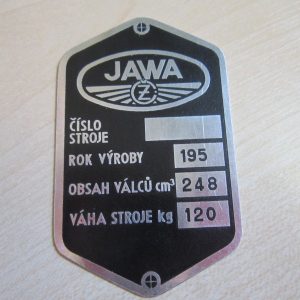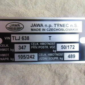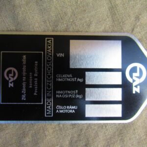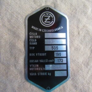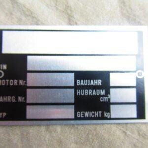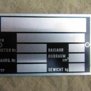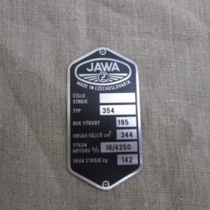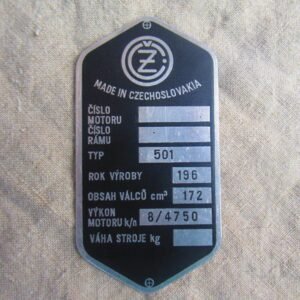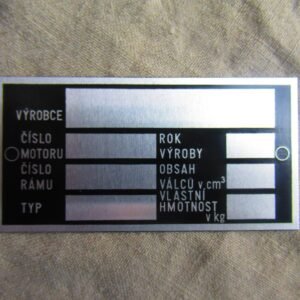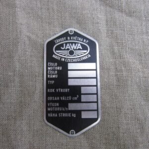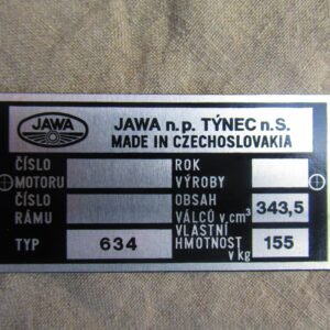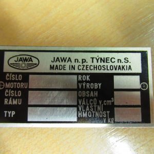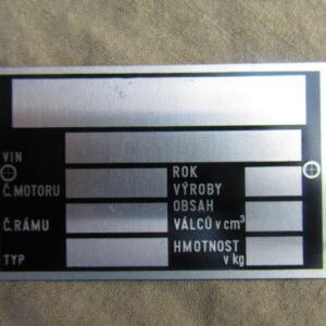Typové štítky jsou vyrobeny podle původních, aby byly co nejblíž originálnímu vzhledu. Jsou leptané, některé údaje jsou vyplněné. Hodnoty, které jsou pro jednotlivé motocykly dané technickým průkazem, vám můžeme vyrazit patřičnými raznicemi. V sekci „služby“ si vyberte, jak velké mají být vyražené údaje. k dispozici jsou raznice o velikosti 3mm, nebo 4mm. Správnou velikost zjistíte ideálně podle původního štítku.